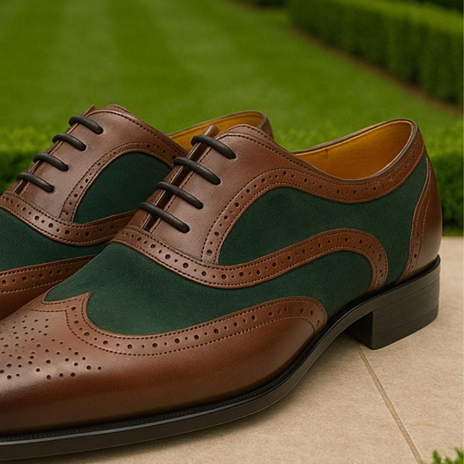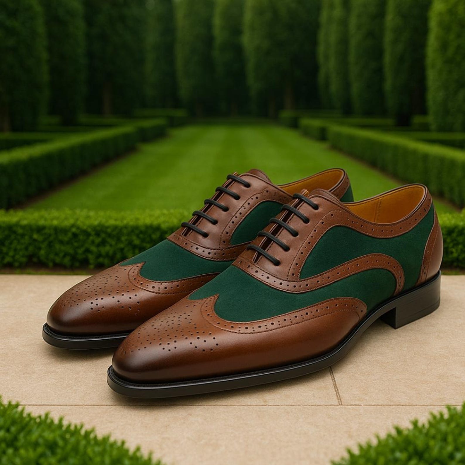The Buff N Co Regal Line Verdant Crown Brogue Oxford is a perfect balance of heritage craftsmanship and contemporary luxury. Featuring a striking combination of rich brown leather and deep green panels, this shoe delivers a bold yet elegant presence designed for gentlemen with refined taste.